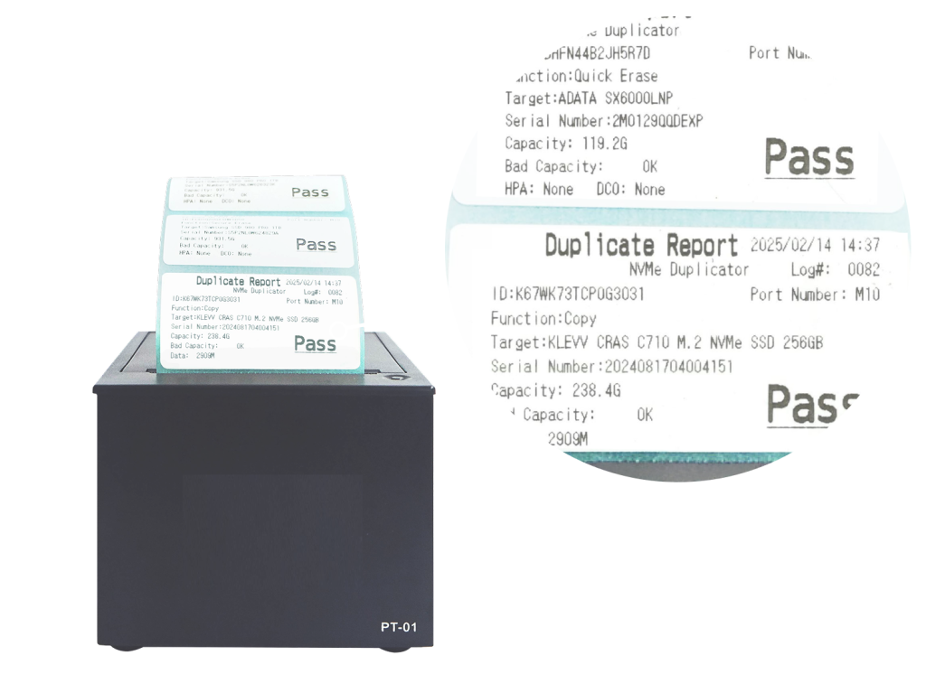 The NVMe CyCLONE supports external printers, allowing automatic label printing with device details and operation results as soon as a task is complete. This feature helps streamline documentation and boosts overall management efficiency.